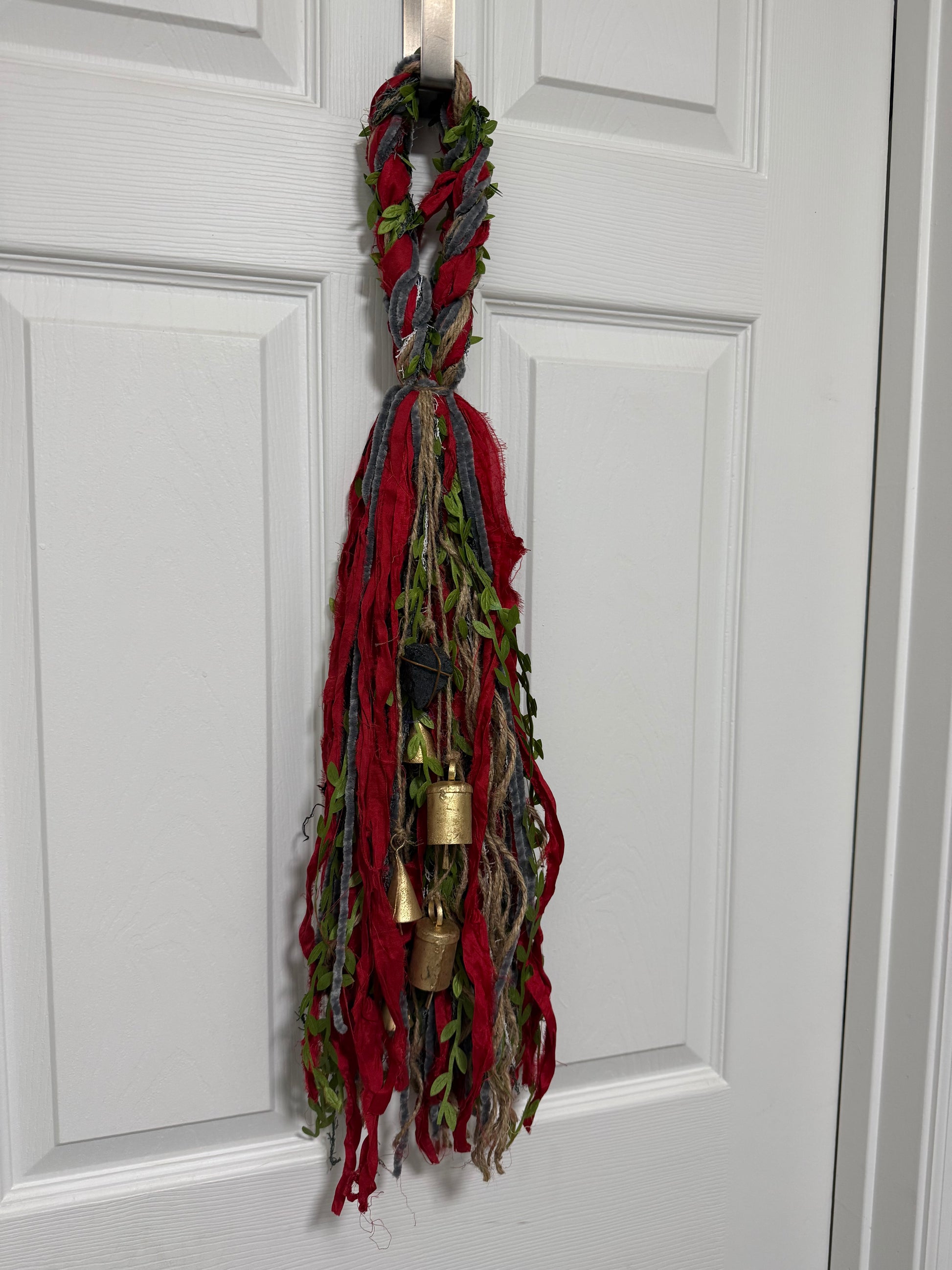 The bells are approximately 27” long and are intended to be hung near a doorway, window, or altar to invite protection and positive intentions. Due to their handmade nature, each one is unique.