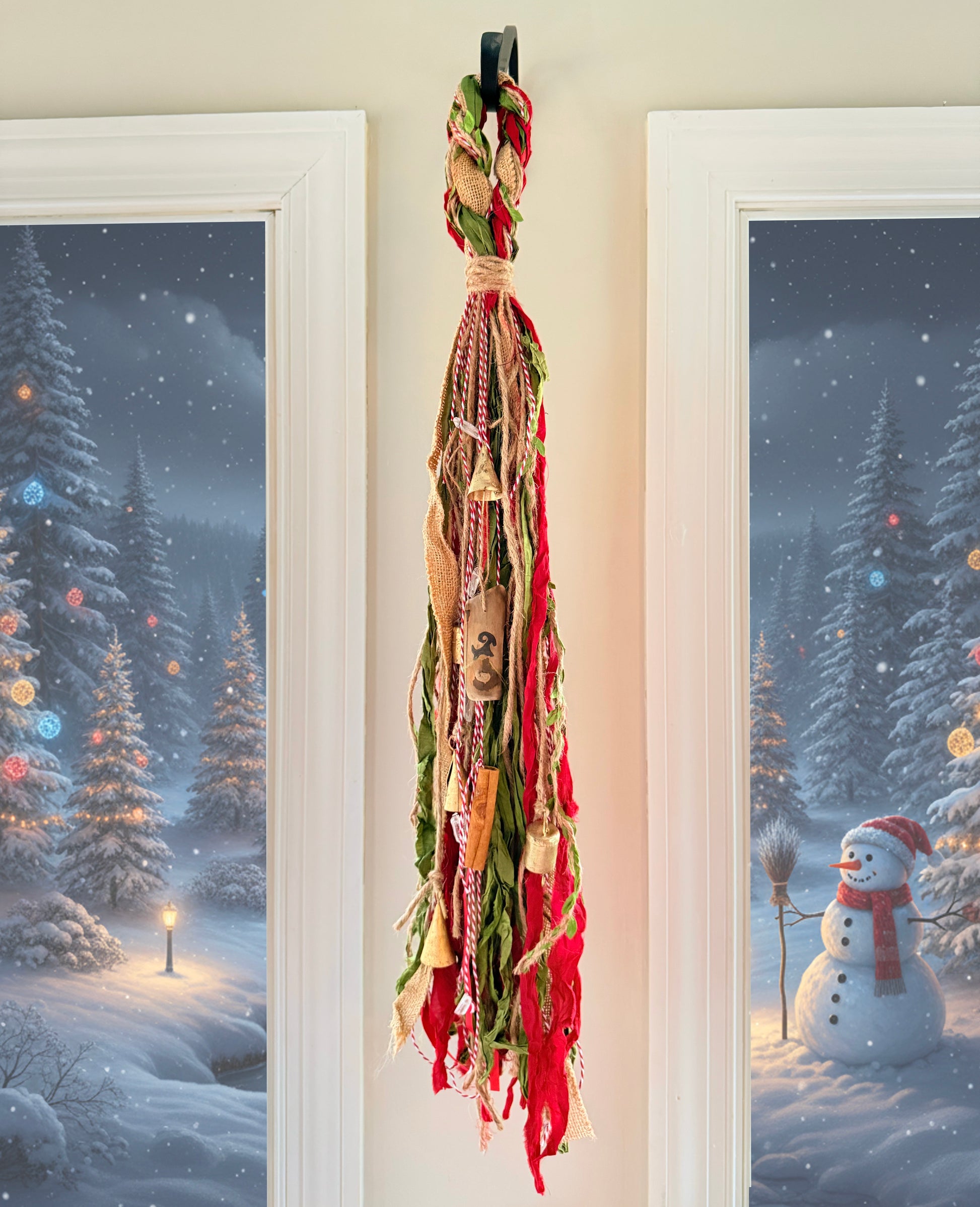 These handcrafted "Witch's Bells" that act as guardians for the home, designed to clear energy, protect sacred spaces, and welcome seasonal magic. This talisman features five golden bells woven with various ribbons, sari silk, a cinnamon stick, and 5 pieces of clear quartz & driftwood with runes.